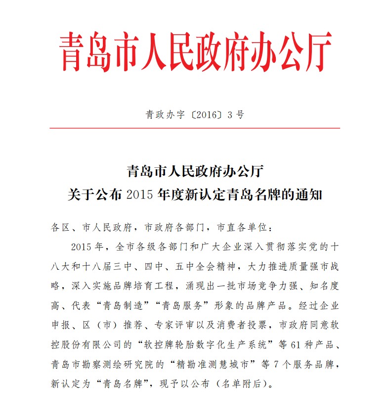 青岛市人民政府办公厅将山东碧海标志服装有限公司认定青岛名牌通知