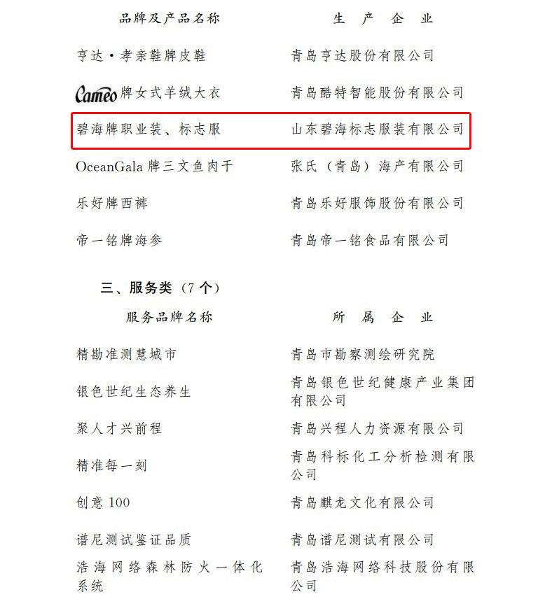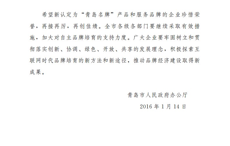 > 青岛市人民政府办公厅将山东碧海标志服装有限公司认定青岛名牌通知