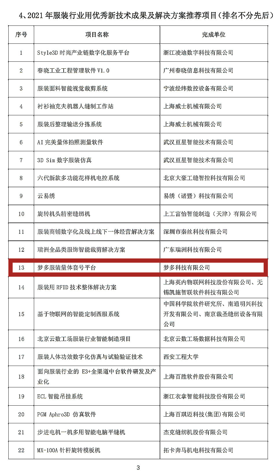 近日,中国服装协会发布了《关于第六届中国服装科技发展会议相关奖项评审结果的公示》,山东碧海标志服装有限公司项目——梦多服装量体套号平台,经评审获得“2021年服装行业用优秀新技术成果及解决方案推荐项目”。